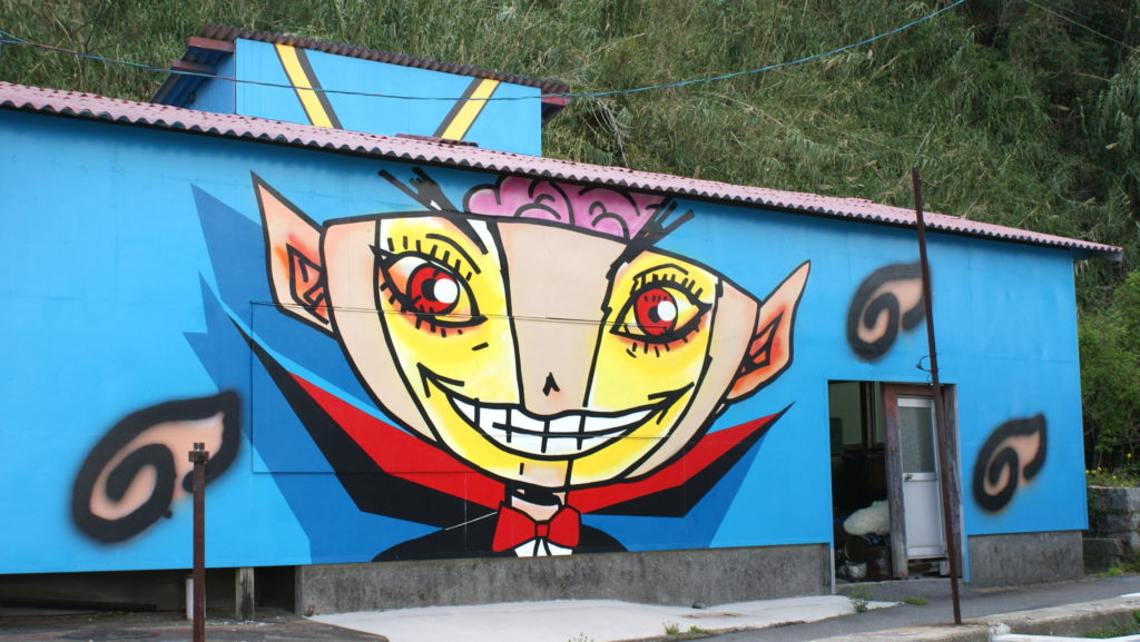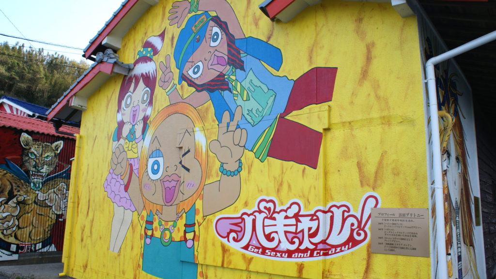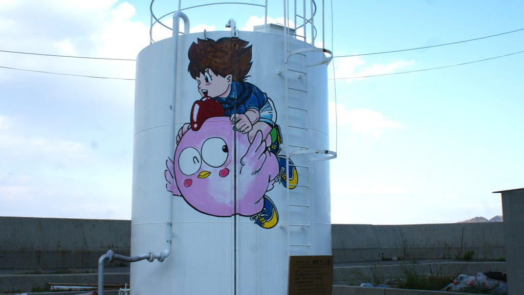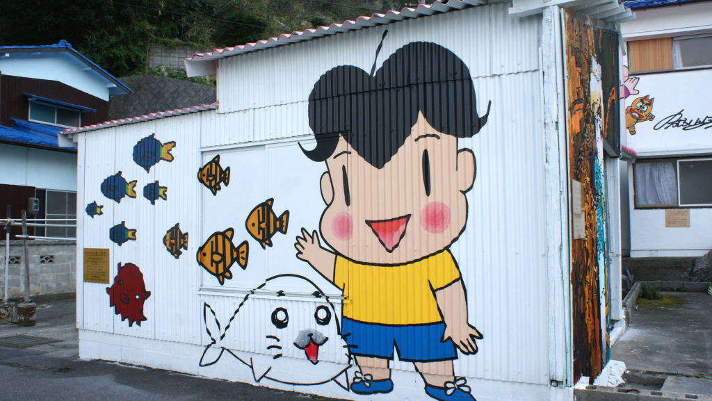 At first, it is said that Mr. Hasebe, cartoon writer, who was impressed with the beauty of this island immigrated here, drew his own work on the wall of his home.It’s called the rumor and empathy, and the cooperation of other cartoonists. Now, more than 15 works have been drawn not only in vacant houses, but also in public halls and water tank.