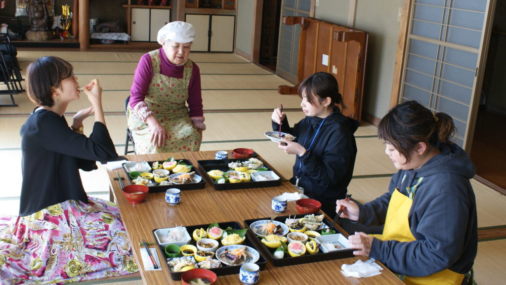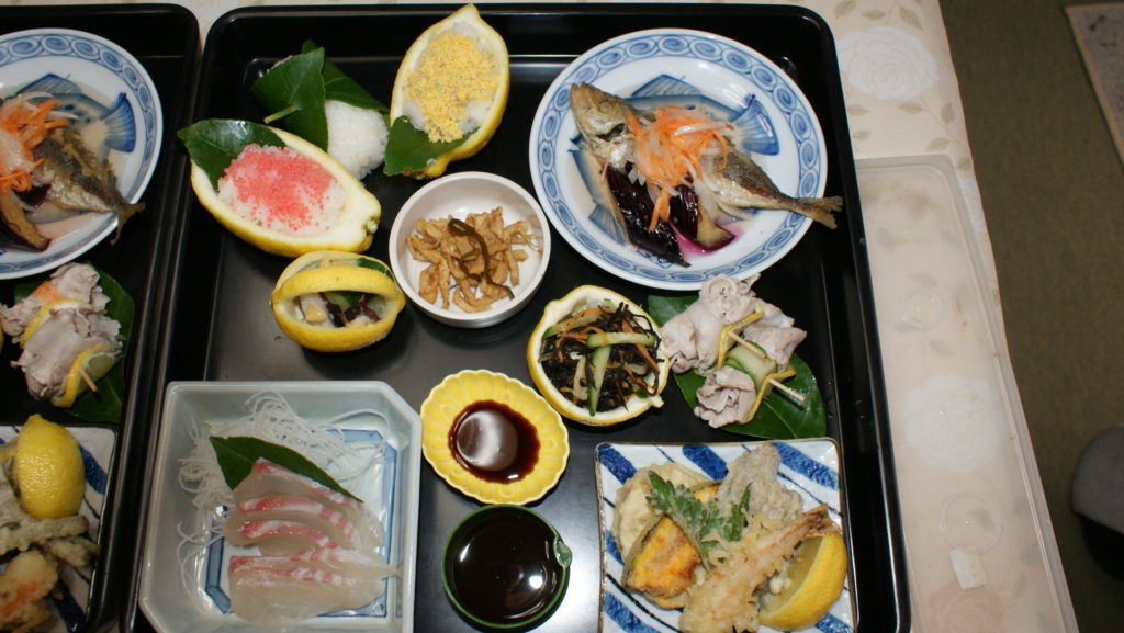 Then, the lemon-kaiseki cooking experience with the reaped lemon.The Iwagi island’s energetic grandma’s four-person group teaches the cooking of the kaiseki cuisine with the lemon in “the shop of Debeso aunt “. “Debeso” in local dialect means “aggressive” and “productive”.