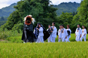 7月~9月にかけ、飯豊町内19神社において300年以上前から、農作物の五穀豊穣・無病息災等を祈願する農村文化の伝統として、「むかで獅子まつり」が繰り広げられ、大切に守り育てています。「飯豊の獅子まつり」の由来は、集落の若者が長蛇になって暴れ舞う獅子と、ムラ一番の力持ちが力比べを行うところから来ております。中でも、「萩生諏訪神社神輿渡御行列」は総勢200人もの行列が並ぶこの地方1番の規模で、町の無形文化財に指定されています。