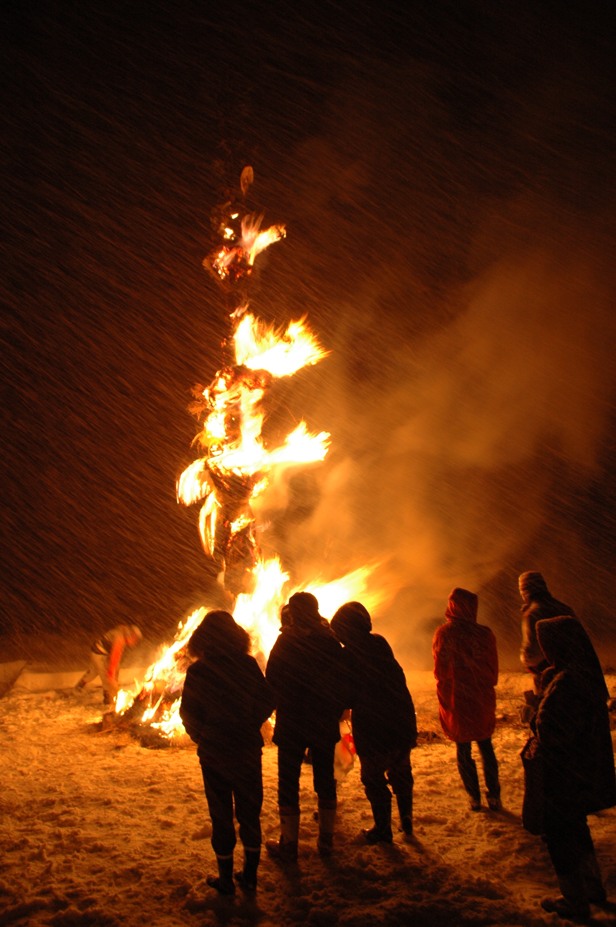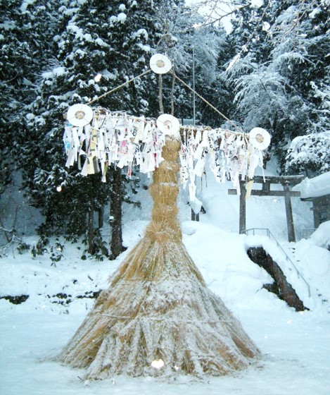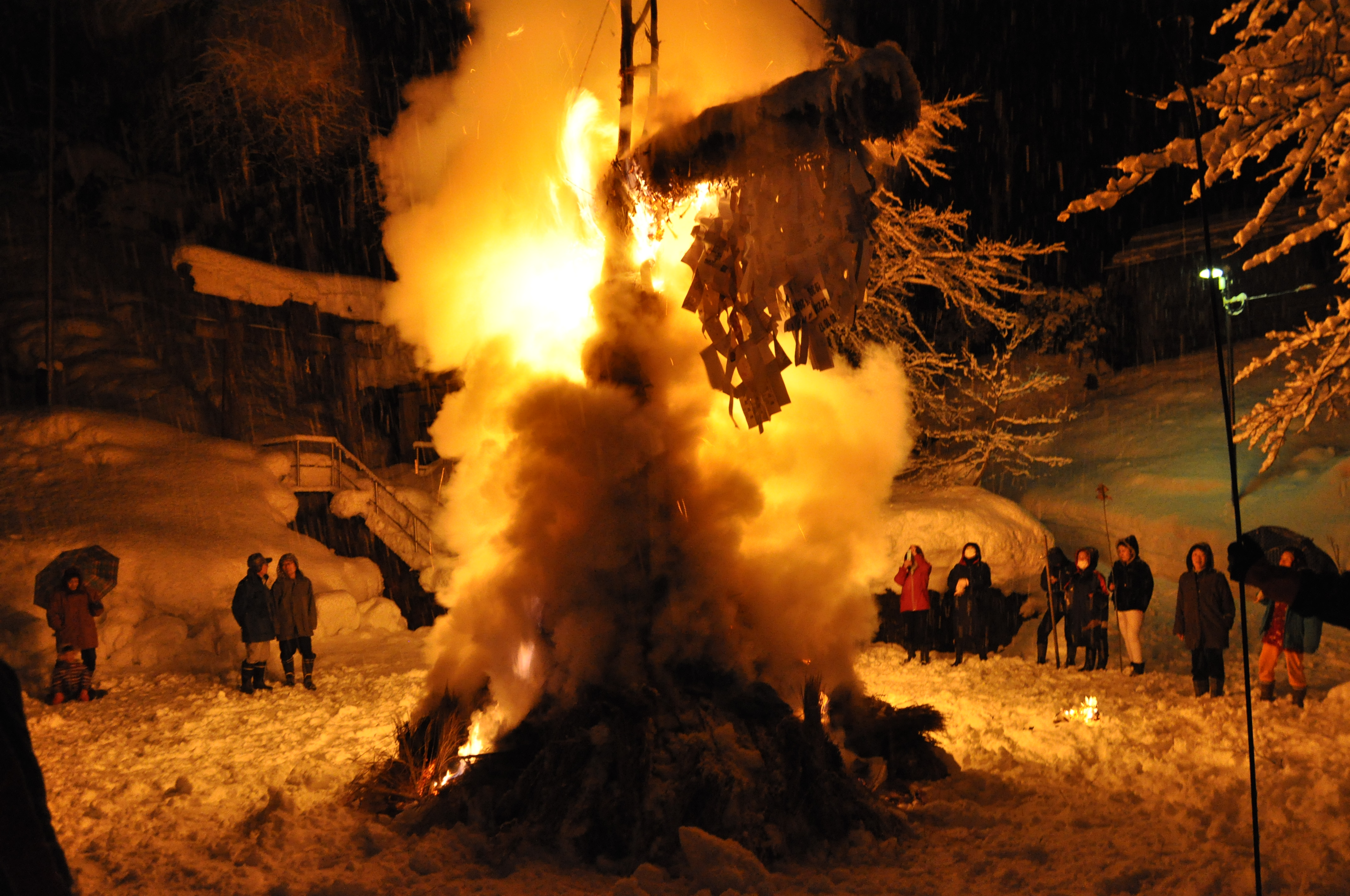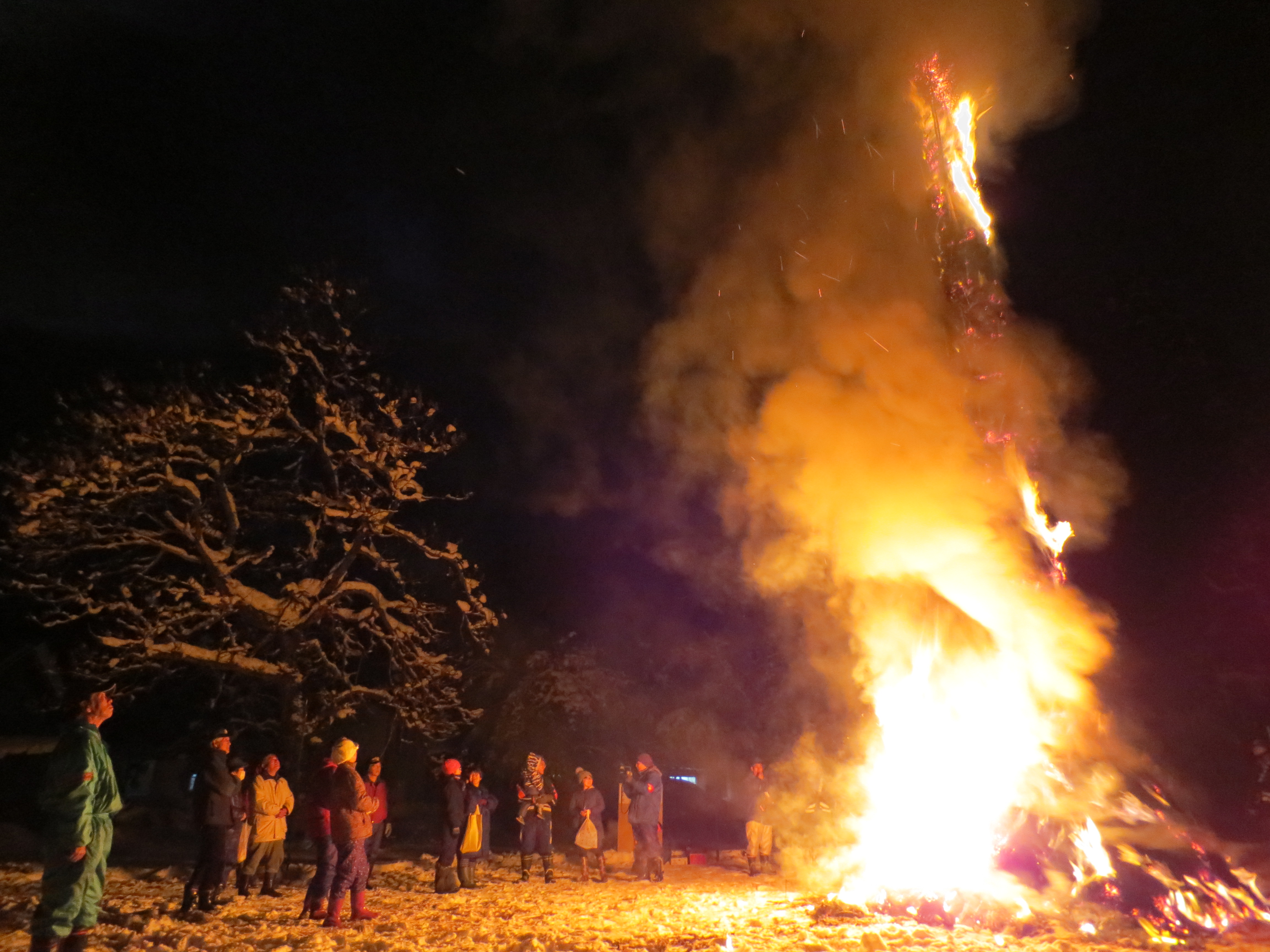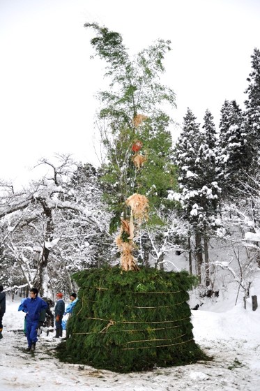福島県会津地方の三島町には「サイノカミ」と呼ばれる伝統的な行事があります。町内の各集落では山から御神木を切り出し、装飾を施します。1月15日の晩、それを燃やすことで五穀豊穣、無病息災、子孫繁栄などと祈ります。