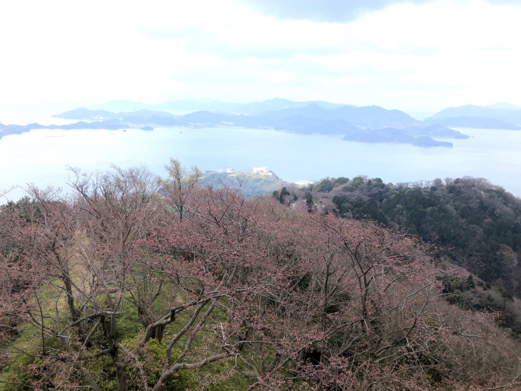 島への連絡船の船着き場を降りてからの頂上へと向かう遊歩道は約6キロ。麓付近と途中は早咲きの桜が咲いていました。