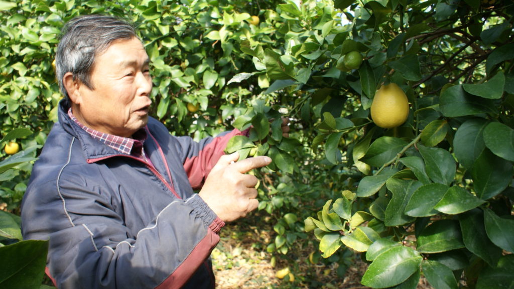 まずは岩城島のレモン栽培の中興の祖ともいえる脇農園代表の脇さんにレモンのことを色々教えていただきます。日本のレモン栽培は昭和38年の輸入自由化に伴いサンキストレモンを中心とする海外の安価なレモンに席捲され一時は壊滅の危機に陥ったそうです。しかしその後アメリカ産レモンから防カビ剤の一種であるOPPが検出されたことを機に、安心安全な国内産レモンが見直され、国内での生産も大幅に増えてきたそうです。岩城島では脇さんが主体となり苗木を各家庭に配るなど地道な努力を続けたこと、また「青いレモン」という商標登録を早期に行いブランド化につとめたこともありいまでは国内のレモン生産では主導的な立場にあります。また岩城島のレモンが全て青いわけではなく、10ー12月に収穫するレモンのみが青く、年を越すと黄色いレモンになるとのことです。